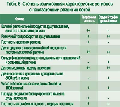 Для выявления факторов, наиболее тесно связанных с вариацией результативных признаков, использован алгоритм, представленный в табл. 1 (см. «ИКС» № 1’2005, с. 58). Каждый из результативных показателей развития операторов связи зависит от отдельной, свойственной именно ему, группы региональных характеристик. Из всех характеристик регионов отобраны те, которые оказывают наибольшее влияние на показатели развития региональных сетей связи (табл. 6).
