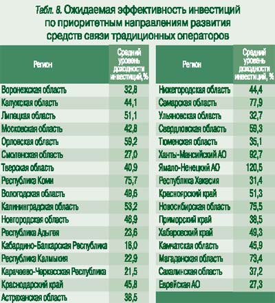 Показатели требуемого объема инвестиций сравниваются с возможным повышением доходов региональных компаний за счет привлечения новых абонентов и увеличения их расходов на услуги связи в соответствии с их платежеспособностью. Это необходимо для определения относительного уровня доходности требуемых инвестиций, позволяющего сравнивать их между отдельными предприятиями и обоснованно планировать временные параметры реализации инвестиционной политики.