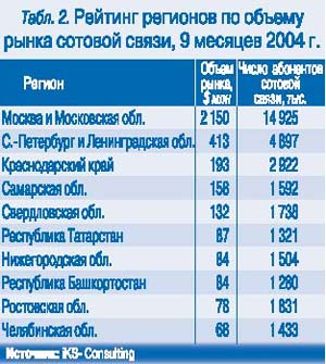 Десять крупнейших региональных сотовых рынков объединяют более 56% российских абонентов. Однако за 9 месяцев 2004 г. эти регионы принесли $3447 млн, или 63% всех доходов от мобильных услуг в стране. На объем доходов от услуг сотовой связи региона влияют два основных фактора – размеры абонентской базы и ARPU, который варьируется от $6 (Ростовская область) до $18 (Московская лицензионная зона). Именно этим объясняется тот факт, что регионы с меньшей абонентской базой смогли заработать больше (табл. 2). Такое неравенство, в свою очередь, говорит о неравномерности: а) тарифов на услуги мобильной связи; б) потребления услуг сотовой связи регионами.
