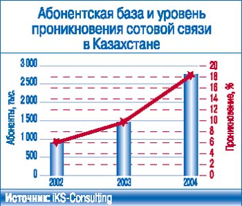 По прогнозам «iKS-Консалтинг», количество абонентов сотовой связи в Казахстане в текущем году вырастет на 65%и превысит 4,5 млн при уровне проникновения 30%. Основной рост произойдет за счет конкуренции между двумя GSM-игроками.