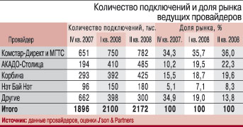 Если обратиться к статистике московского рынка от J’son & Partners (таблица), то по состоянию на конец июня 2008 г., 36% рынка «домашнего» ШПД в Москве занимала группа компаний «Комстар» («Комстар-Директ» и МГТС). Второе место принадлежит компании «АКАДО-Столица», занимающей 22,3% рынка, тройку лидеров с 19,6% рынка замыкает «Корбина Телеком».