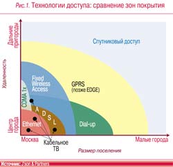 Основной потенциал широкополосного беспроводного доступа связан с географическим охватом: во многих случаях, в первую очередь на окраинах крупных городов и в их пригородах, такие сети являются единственной возможностью получить широкополосный двусторонний доступ дешевле $1000 (рис. 1).