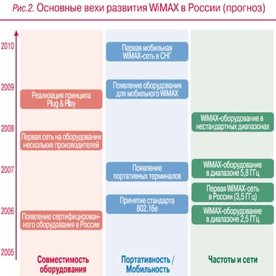 О портативности и мобильности. WiMAX Forum обещает в 2006 г. вывести на рынок WiMAX-модемы в формате PC-card, тем самым обеспечив портативность, а в 2007 г. ожидается мобильная версия WiMAX. Однако если обратить внимание на отсутствие даже демонстрационных образцов портативных решений и на задержку с разработкой мобильного стандарта 802.16e, становится очевидной излишняя оптимистичность данных обещаний. Точные сроки появления такого оборудования сейчас, вероятно, назвать не сможет никто. Видимо, и производителям, и операторам в своих планах следует ориентироваться на начало реальных продаж портативных WiMAX-решений в 2007 г. и на запуск первых в мире мобильных WiMAX-сетей не раньше 2009 г. В России с учетом особенностей национального регулирования отрасли связи «мобилизация» WiMAX может еще больше затянуться.