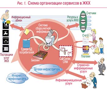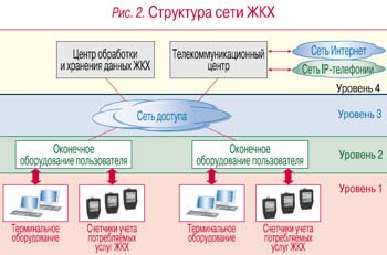 Инфраструктура жилищно-коммунального хозяйства (рис. 2), которая базируется на многоуровневой архитектуре, создается для обеспечения различных сервисов, а также для поддержания работы распределенной системы сбора учетной информации о потреблении коммунальных ресурсов (электроэнергия, газ, тепло, вода и т.д.) и системы внутреннего электронного документооборота подразделений ЖКХ. Дополнительно она может использоваться для предоставления индивидуальным и корпоративным пользователям различных телекоммуникационных услуг (доступ в Интернет, IP-телефония, справочно информационные сервисы и др.).