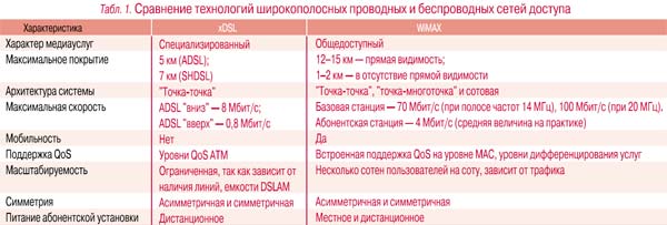 В наши дни для построения широкополосных проводных сетей доступа наиболее часто применяется технология цифровых абонентских линий xDSL в различных ее модификациях: ADSL, HDSL, SHDSL, SDSL и др. (сравнение их характеристик с технологией WiMAX приведено в табл. 1).