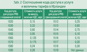 Для получения пользователем информации, например о тарифах на услуги PRS или о проведении конкурса, ему выделяется код доступа, позволяющий получить запрашиваемую информацию бесплатно. Коды доступа, соотносимые с конкретной стоимостью услуг, выделяются для унифицированной тарификации на территории всей страны. Под кодом доступа понимаются не только коды АВС и DEF, но и более длинные, состоящие из 4–5 цифр. Первые три цифры у них – это тот же код АВС или DEF (они используются для маршрутизации вызова), а четвертая и пятая цифры введены для определения, например, тарифа или категории услуг. То есть по номеру услуги PRS пользователь может определить либо ее точную стоимость, либо некий ценовой диапазон. Такой метод информирования абонентов о тарифах на услуги PRS принят также в Великобритании, Ирландии, Италии и др. (В табл. 2 показан пример соответствия кодов доступа и тарифов на услуги, утвержденных регулирующим органом Ирландии.) Если вызывается услуга, владелец которой назначил тариф, отличный от унифицированного, пользователь перед оказанием услуги должен быть предупрежден о разнице в цене.