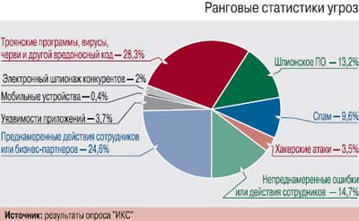 Всегда опасны вирусы, трояны, спам и хакеры. Несмотря на то что ущерб от спама невысок по сравнению, скажем, с преднамеренными действиями сотрудников, вероятность его реализации огромна и несравнима с инсайдерской угрозой. Серьезную опасность несет использование мобильных и беспроводных устройств, поскольку в погоне за функциональностью производители переносных ПК и смартфонов не всегда обращают должное внимание на ИБ.