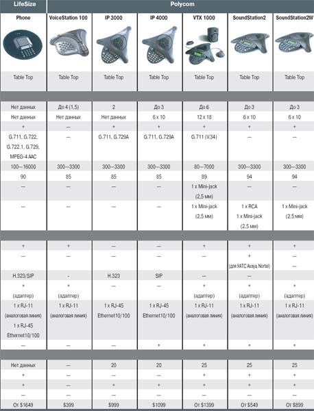 LifeSize – самый молодой (осень 2005 г.) вендор на рынке АКС. Особенностью его системы LifeSize Phone, напоминающей летающую тарелку, является возможность работы как автономно в качестве конференц-телефона, так и в составе линейки ВКС этого производителя в качестве высокоэффективного микрофона с беспрецедентной зоной покрытия. LifeSize Phone – конференцтелефон нового поколения с «круглым» дизайном. В системе реализовано множество инженерных инноваций. Благодаря технологии Circular Microphone Array («многонаправленная» архитектура) допускается использование 16(!) микрофонов и лучевой технологии формирования, когда каждый микрофон работает постоянно, обеспечивая отличное соотношение сигнал/шум. В устройстве реализован алгоритм MPEG-4 AAC с частотой до 16 кГц в зависимости от типа подключения, а за счет титанового громкоговорителя еще и превосходный звук на низких частотах без сабвуфера. Компания LifeSize заявляет о высокой направленности и двойной по сравнению с любыми существующими решениями зоной покрытия. Однако точных данных пока нет, поэтому в сравнительной таблице данная позиция обозначена как «Нет данных». Для больших конференц-залов можно объединять два устройства. Возможно, сегодня это действительно лучшее устройство на рынке, однако цена в $1649 – самая высокая среди всех систем, представленных в обзоре.