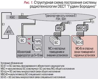 Структурная схема системы ПТС на базе радиотехнологии DECT (рис. 1), которая внедрена и используется в ряде организаций РФ, разработана на основе системы «Гудвин Бородино» (производства компании «Гудвин-Европа»). Управляющий контроллер базовой станции (КБС) – центральное коммуникационное ядро системы. Он обеспечивает выполнение всех централизованных функций (верхний уровень управления БС) и сопряжение с телефонными сетями, например с городской или учрежденческой АТС.