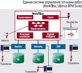 Вариант I. Внедряется несколько информационных систем (например, CRM, биллинг, Inventory), и в каждой из них содержатся подсистемы WF. Как следствие, для получения сквозных процессов, по которым можно отслеживать бизнес-показатели, требуется постоянная и кропотливая интеграционная работа.