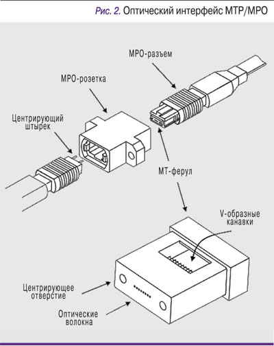 Поскольку оптические соединения в точках кросс-коннекта, создаваемых для систем хранения данных, имеют значительный объем, закономерно возник вопрос о возможности коммутации нескольких оптических волокон в одном элементарном разъемном соединении. Эта задача была решена с помощью нового типа оптического ферула – МТ-ферула, который представляет собой планарный многоволоконный ферул с выкладкой оптических волокон в V-образные канавки. Впоследствии на его основе был разработан и стандартизован новый многополюсный оптический интерфейс MPO (Multi-Fiber Push On) (рис. 2).