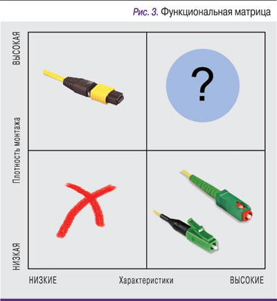 Однако интерфейс МРО обладает и целым рядом конструктивных недостатков, которые ограничивают его применение в системах, требующих высокой производительности. Основное ограничение – невозможность достичь таких же передаточных характеристик, как у разъемного соединения на основе типовых соединителей, например LC или SC. Вследствие этого при проектировании кабельной системы необходимо заранее оценить, насколько плотность монтажа важна по сравнению с ограничением допустимого бюджета потерь системы из-за большого вносимого затухания (рис. 3).