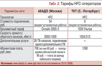 По такой технологии, например, работают сети АКАДО («Комкор-ТВ») в Москве и «Телекомпании Санкт-Петербургское кабельное телевидение» (ТКТ) (табл. 2). Они предлагают не только услуги цифрового кабельного ТВ и доступ в Интернет, но и пакеты услуг «Интернет+ТВ» со скидками для подписчиков.Самой же большой популярностью в последние годы пользуется конгломерат оптоволокна до дома FTTH (Fiber to the House) и медного кабеля внутри него. В такой сети, работающей по протоколу Ethernet, скорости передачи данных в обе стороны одинаковы, да и сами скорости существенно выше – до 100 Мбит/с. Этого вполне хватает для двусторонней передачи видео в реальном времени. Несомненными преимуществами Ethernet-сетей являются их хорошая масштабируемость и управляемость.