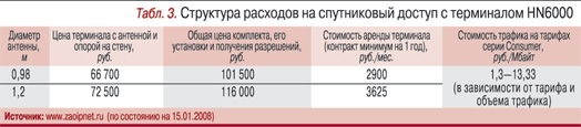 Конечно, спутниковую последнюю милю дешевой не назовешь, и в первую очередь из-за стоимости оборудования (табл. 3), но тянуть кабель в некоторые районы России выйдет еще дороже.Правда, в деле строительства кабелей в последнее время есть кое-какие подвижки. Конечно, в самые глухие углы магистральные операторы по-прежнему идти не собираются, но в 2007 г. в регионы активно двинулись «Голден Телеком» и «Корбина Телеком». Их проект «Triple-65» предусматривает строительство сетей FTTH в 65 крупных городах России с общим населением порядка 65 млн человек. Сети планируется подводить к домам, где более 100 квартир, а в таких проживает в общей сложности около 65% населения этих городов. Завершить проект планируется к 2010 г., но подключения уже начались. Появление сильного федерального провайдера в любом городе почти наверняка означает усиление конкуренции и снижение цен для местных интернет-пользователей. Так что можно надеяться, что через год-два цены на интернет-доступ в регионах подтянутся к московским и цифровое неравенство хотя бы отчасти сгладится.