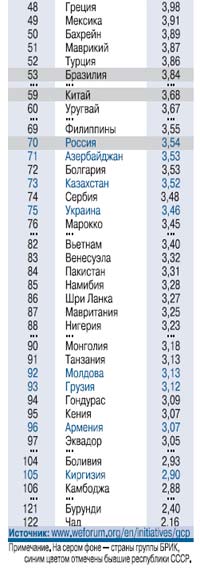 Всемирный экономический форум обнародовал результаты исследования под названием The Global Information Technology Report 2006–2007. Рейтинг, составленный аналитиками форума, показывает сравнительный уровень влияния информационнокоммуникационных технологий на развитие и конкурентоспособность государств. Нынешним исследованием было охвачено 122 страны. Россия заняла лишь 70-ю строчку, поднявшись, впрочем, по сравнению с прошлогодним рейтингом на две позиции.