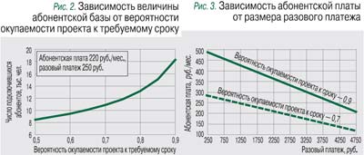 - как размер абонентской платы зависит от величины разового платежа при разных значениях условной вероятности возврата инвестиций к требуемому сроку (рис. 3).