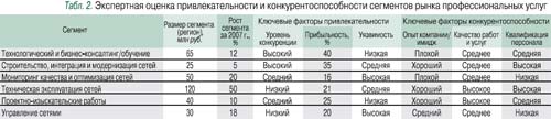 По аналогичной схеме выбирались ключевые показатели конкурентоспособности сегментов рынка. После приведения всех показателей к общей шкале производилась экспертная оценка каждого сегмента по принятым критериям привлекательности и конкурентоспособности (табл. 2).