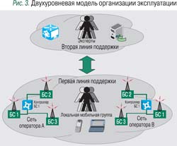Двухуровневая модель организации эксплуатации сети включает в себя две линии поддержки: первая – мобильные группы локальных специалистов широкого профиля на базе представительств компании; вторая – высококвалифицированные специалисты-эксперты центрального офиса компании, оказывающие информационную поддержку специалистам первой линии (рис. 3).
