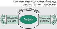 - Платформа. Взаимодействие обеих категорий пользователей осуществляется через единую платформу – это те продукты и услуги, которые позволяют объединить две группы пользователей. Платформа, как правило, состоит из инфраструктуры (аппаратное и программное обеспечение), стандартов, гарантирующих совместимость ее элементов, и правил, определяющих условия осуществления транзакций, права и обязанности пользователей. Двусторонняя сеть на базе платформы обнаруживает более сложный порядок взаимоотношений и взаимозависимостей между ее участниками.