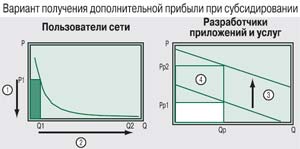 - разработчики приложений и услуг готовы платить больше за доступ к большему числу пользователей сети – кривая спроса этой категории смещается вверх;