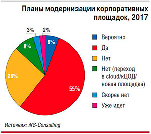 Согласно исследованиям iKS-Consulting, в 2016–2017 гг. более половины (55%) российских компаний планируют провести модернизацию корпоративных дата-центров. Некоторые (8%) воспользуются услугами коммерческих ЦОДов, часть хочет иметь свою инфраструктуру. Самый популярный в стране вариант – классический стационарный ЦОД (95%, по данным iKS-Consulting). На модульные и контейнерные ЦОДы приходится соответственно 4% и 1% .