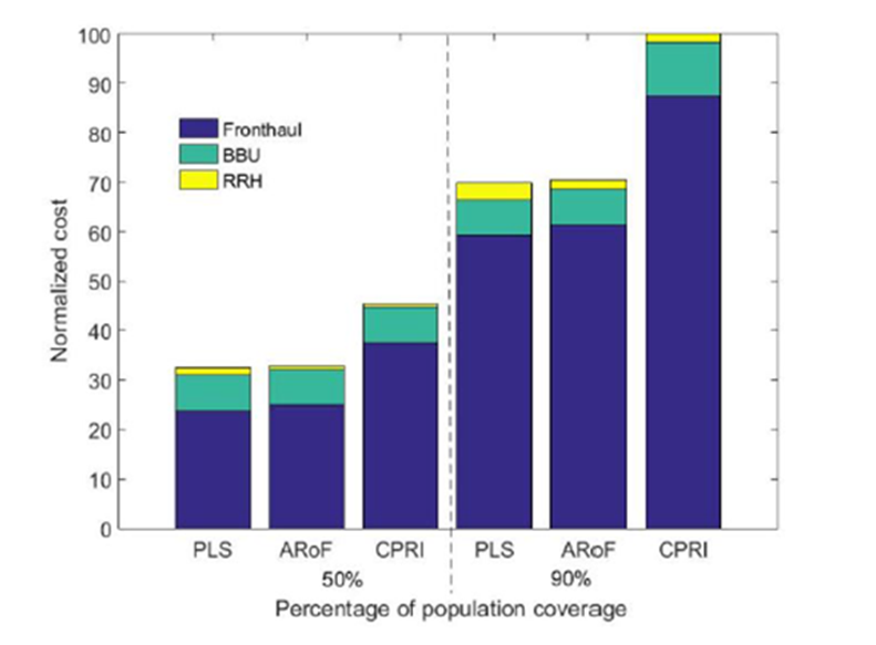 Рассмотрим подробнее структуру стоимости системы 5G RAN. Подсистема Fronthaul может быть построена разными способами: например, с использованием CPRI или двух различных вариантов распределения функций цифровой обработки сигнала между RRH и BBU. Вариант PLS (Physical Layer Split) предполагает перенос в RRH функций цифровой обработки для MIMO, а вариант ARoF (Analog Radio over Fiber), напротив, -- перенос всех функций цифровой обработки в BBU (в том числе функции аналого-цифрового преобразования и цифровых функций предискажения сигнала для максимизации линейного диапазона усиления). Расчеты стоимости сети 5G RAN с учетом инсталляционных работ, сделанные для разной степени охвата населения (50% и 90%), показывают (рис. 3), что на долю Fronthaul приходится более 70% всех затрат. Следовательно, Fronthaul не может рассматриваться как «составная часть» базовой станции и является в централизованной сети 5G RAN самостоятельным ключевым сетевым доменом.
