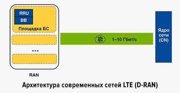Новая компоновка базовой станцииСуществующие сети 2G/3G/4G построены, как правило, на основе так называемой распределенной архитектуры сети радиодоступа (Distributed RAN, D-RAN), в которой составные части базовой станции -- модуль цифровой обработки BBU (Baseband Unit) и радиомодули RRU (Remote Radio Unit) -- располагаются на одной площадке (рис. 1). Такое расположение позволяет минимизировать требуемую емкость транспортной сети. В зависимости от топологии емкость транспортного домена «последней мили» составляет от 1 до 10 Гбит/с.