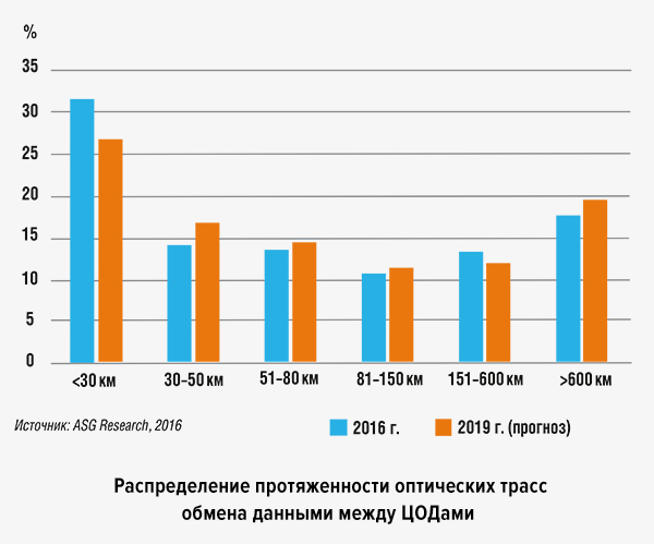 Важно отметить, что в мобильной индустрии наиболее часто применяются интерфейсы CPRI и eCPRI для скоростей до 25 Гбит/с, т.е. значения «базовой скорости» ИT-индустрии. Кроме того, планируемая длина оптического канала для решений X-Haul совпадает с наиболее распространенной протяженностью оптических трасс для обмена данными между ЦОДами (до 30 км, рис. 5).