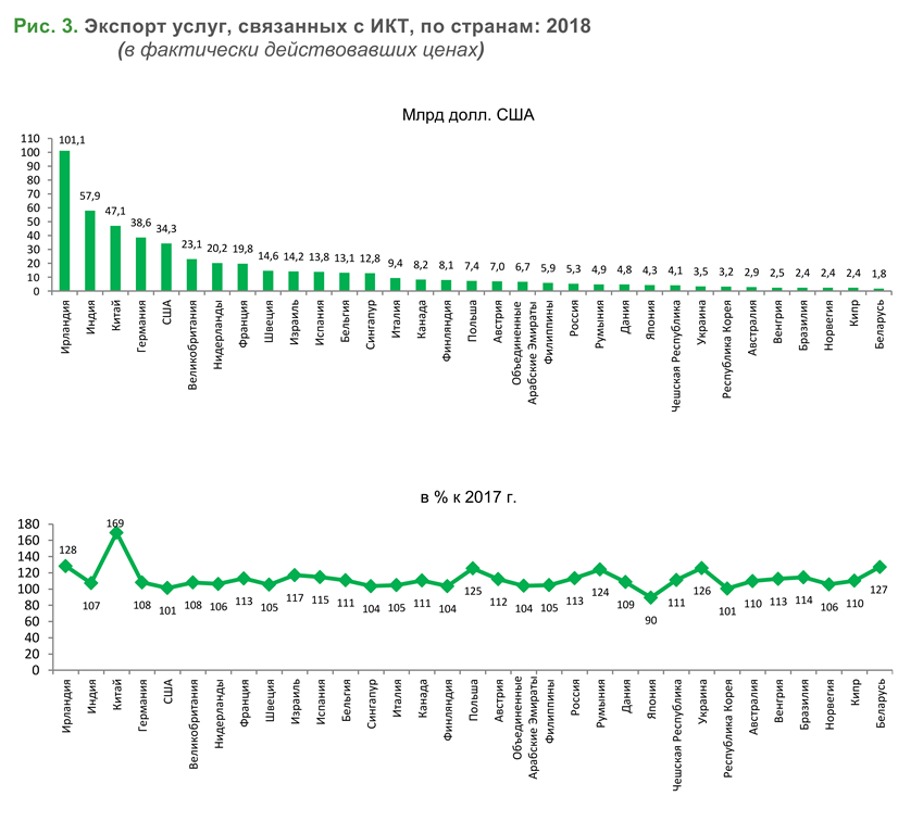 По сравнению с 2017 г. в пятерке стран — лидеров по объему экспорта услуг, связанных с ИКТ, значительно укрепил свои позиции Китай: темп роста экспорта на уровне 169% позволил обойти Германию (108% к 2017 г.) и США (101%). Российская динамика (113%) соответствует среднемировой (114%).