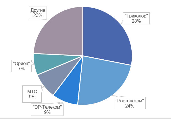 ТОП-5 операторов ТВ также показали в четвертом квартале лучшие результаты по подключениям за год, при этом основные подключения обеспечили «Ростелеком» и МТС. Лидер рынка, оператор одноименной спутниковой платформы «Триколор», сохранил набранную базу. «Ростелеком» на второй позиции прибавил 130 тыс. абонентов, МТС в свою очередь — порядка 91 тыс. «ЭР-Телеком» уже четвертый квартал подряд не демонстрирует роста, приводя в порядок ранее приобретенные активы и интегрируя их в свою сеть. Еще один спутниковый оператор, «Орион», подключил чуть менее 20 тыс. абонентов.