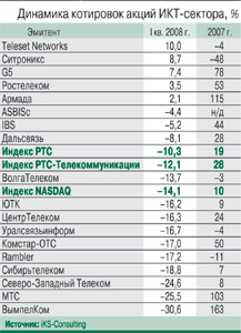 Прогнозы на II квартал не слишком оптимистичны: скорого выхода американской экономики из кризиса ожидать не стоит. Российские индексы, на 2/3 формируемые акциями нефтяных компаний, не имеют большого потенциала роста: стоимость нефти находится на уровне исторического максимума.Шанс на рывок в конце II квартала имеют некоторые МРК, которые должны опубликовать отчетность по МСФО за 2007 г. Если операторы сумеют показать хорошую прибыль за счет внедрения новых сервисов, в частности предложения в регионах услуг широкополосного доступа в Интернет, то они смогут привлечь к себе внимание инвесторов. Хорошие перспективы и у МРК, владеющих сотовыми активами (рост ARPU коснулся и их), таких как УРСИ и «Сибирьтелеком». Позитивно повлиять на телекоммуникационный сектор может начавшаяся коррекция на сырьевых рынках: не исключено, что деньги вернутся в ИКТ-сектор.
