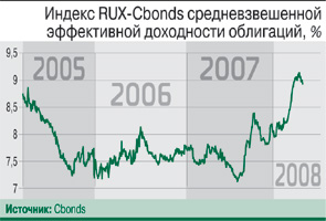 На долговом рынке наблюдалось резкое снижение спроса на новые выпуски облигаций. Для привлечения кредиторов эмитенты вынуждены были существенно поднимать ставки. В результате средневзвешенная доходность по индексу RUX-Cbonds поднялась до рекордного уровня в 9,1%. Столь сложной ситуации на долговом рынке не было даже в августе 2007 г. Отдельные выпуски эмитенты продавали со ставкой первого купона свыше 15%.