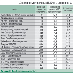 Большинство ПИФов в I квартале 2008 г. принесли вкладчикам убытки. Мощная 15%-ная коррекция не оставила шансов на достижение положительных результатов. Более того, значительная часть фондов показала доходность хуже, чем отраслевой индекс «РТС-Телекоммуникации».