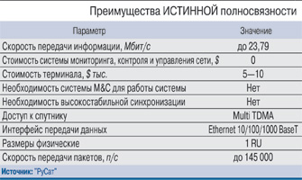 Для SkyWire несущая в 1,4 МГц позволяет иметь дуплекс-ный канал 600 кбит/с с возможностью разгона каждого устройства в режиме полосы по требованию до 1,5 Мбит/с, т.е. даже выше пикового значения для SCPC-устройства. То есть по сравнению с SCPC (при тех же режимах модуляции) экономится около 400 кГц полосы. При средней стоимости ресурса $5 тыс. за 1 МГц, 400 кГц дает экономию в $2 тыс. в месяц, или $24 тыс. в год.