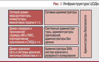 В центре обработки данных принято выделять три инфраструктурные области (домена) – локальной сети, серверов и приложений, хранения (рис. 1). Это разделение влияет не только на проектные решения, принимаемые при создании элементов инфраструктуры, но и на организацию оперативного управления, на административное деление команды ИТспециалистов, на сферы подчинения и т.п. Вместе с тем информационную безопасность (ИБ) должен обеспечивать комплекс мер, применяемых во всех доменах.
