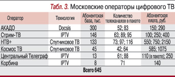 В Москве крупнейшие операторы цифрового телевидения – Акадо, «Стрим-ТВ», НТВ+, «Космос ТВ», «Центральный Телеграф») – обслуживают около 650 тыс. абонентов (табл. 3). Проникновение цифрового ТВ составляет 17%. Конечно, можно учесть 1 млн пользователей расширенного пакета «Мостелекома» – в этом случае уровень проникновения платного ТВ в Москве сразу вырастет до 44%. И все-таки 31 канал по цене 95 руб.* – это уже вчерашняя услуга…