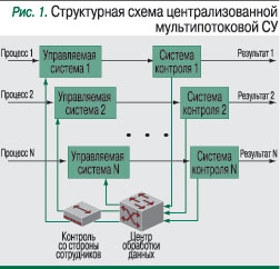В случае системы управления качеством входным сигналом является процесс (например, процесс оказания услуг связи), а звеном обратной связи – центр обработки данных (ЦОД). Здесь собираются данные по результату выполнения процесса, управляющий поток воздействует непосредственно на управляемую систему. Особенность этой системы управления в том, что управляющий поток – это не процесс, а данные, т.е. он не является потоком того же класса, что и входной поток управляемой системы.Система управления качеством, как правило, охватывает не один, а множество объектов управления, как аппаратные системы, так и бизнес-процессы. Следовательно, у нее будет множество входов и выходов (т.е. она будет мультипотоковой, рис. 1).