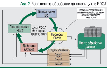 Теперь привяжем эту модель к процессу контроля качества в компании-операторе сотовой связи. Наиболее эффективен циклический процесс совершенствования качества продукта по Э. Демингу, позволяющий влиять не только на исполнителей, но и на этапы жизненного цикла продукта. Схема интеграции ЦОДа в процесс совершенствования качества услуг показана на рис. 2.Принцип работы системы по этой схеме следующий: