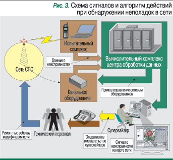 Основа работы ЦОДа в операторской компании – обработка данных мониторинга сети для обеспечения стабильности качества предоставляемых услуг. Мониторинг «внутренних» параметров сети регламентируется стандартом предприятия «Правила технической эксплуатации сетей сотовой подвижной связи», разрабатываемым каждой компанией на основе типовых «Правил технической эксплуатации сетей сотовой подвижной связи», а «внешний» мониторинг параметров сети осуществляется с помощью мобильных испытательных комплексов на основе стандарта предприятия, опирающегося на «Нормы на показатели качества услуг сотовой подвижной связи и методики контрольных испытаний».Слежение за «внутренними» параметрами сети и обнаружение неисправностей происходит на уровне канального оборудования. Сигнал о неисправности идет от ближайшего к аварийному участку исправного устройства. Все данные о работе канального оборудования собираются в ЦОДе, фиксируются в базе данных (журнале) и обрабатываются. На их основе вычислительный комплекс обновляет функциональную карту сотовой сети, вырабатывает рекомендации по устранению неисправности и направляет их в соответствующие отделы компании, где компетентные лица принимают решения о вмешательстве (рис. 3). ЦОД может также управлять сетью в автоматическом режиме – при отказе одного звена сети перенаправить трафик через другие и т.п.