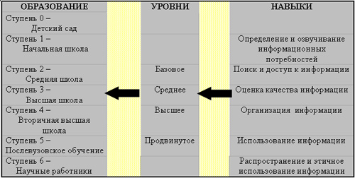Все существующие стандарты основаны на том, что достижение информационной грамотности являются непрерывным процессом (континуумом) как с позиции средств или методов, требуемых на различных этапах и уровнях обучения человека, так и в смысле того, что применяемые средства используются интегральными способами, а не как строго линейные последовательные процессы. Так в ходе получения образования развитие информационной грамотности начинается на самой ранней стадии в школе и продолжается при получении высшего образования и в ходе последующего пожизненного обучения. В более развитых странах развитие информационной грамотности объединяется с получением навыков по использованию ИКТ, поскольку в настоящее время цифровые технологии и электронные базы данных являются первичным источником получения информации. Таким образом требуется объединение познавательных и технических навыков, необходимых в процессе доступа к информации и ее использования. Непрерывность процесса достижения людьми информационной грамотности, определяемая существующими стандартами, может быть представлена в виде структуры на рис. 1.