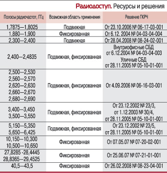 При разумном использовании такой полосы частот вполне достаточно для реализации всех планов по предоставлению услуг связи, в том числе широкополосных. При современных технологиях радиодоступа и плотности 10 тыс. абонентов на 1 км2 потребуется не более 200 МГц полосы частот для предоставления каждому абоненту 1 МГц полосы.В России коммерческие сети фиксированного радиодоступа городского и регионального масштабов могут строиться в диапазоне частот от 1,7 ГГц до 6,4 ГГц (см. таблицу). Это самые распространенные сети, поскольку для их строительства имеется полный комплект норм, установленных действующим законодательством. Их создают на оборудовании стандартов 802.16d, 802.11а/b/g, технологии DECT и некоторых «фирменных» стандартов. До начала строительства сетей фиксированного радиодоступа оператор должен получить решение ГКРЧ, лицензии, сертификаты и декларации. Сложность заключается в том, что все эти документы нужны одновременно.