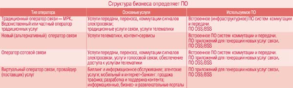 Операторы расширяют бизнес Сегодня мы наблюдаем активные процессы расширения и изменения бизнес-процессов на операторском рынке. Структура и особенности бизнеса различных групп операторов влияют и на их требования к конфигурации систем OSS/BSS (таблица).