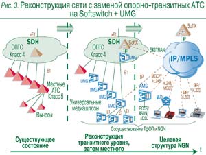 - Реконструкция местного уровня сети с заменой местных АТС на медиашлюзы доступа высокой емкости, развитие оптических сетей доступа на основе медиашлюзов малой и средней емкости, внедрение широкополосных интерфейсов доступа xDSL. Начало внедрения мультимедийных решений IMS на основе MSAN.