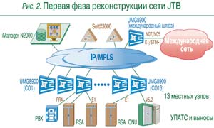 На первом этапе реконструкции (рис. 2), завершившемся в конце 2003 г., на сети JTB была заменена 41 местная АТС на 13 медиашлюзов большей емкости (UMG). К ним по каналам E1 PRI были подключены абонентские выносы и мультисервисные сети доступа (ONU), в дальнейшем подлежащие модернизации до уровня AMG путем добавления платы протокола H.248. Это позволило существенно упростить структуру сети, расширить ее сервисные возможности, снизить OPEX.