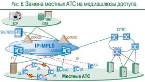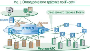 Второй этап предполагает создание IP/MPLS-сети или модернизацию существующей IP-сети до уровня MPLS и ее использование для отвода речевого трафика (рис. 5) с целью разгрузки транспортной сети TDM. Управление предоставлением базовых речевых услуг осуществляется сигнальным коммутатором Softswitch. Приступать к третьему этапу – модернизации устаревшихи выработавших свой ресурс местных АТС на уровне доступа – можно по окончании реконструкции транзитного уровня сети или одновременно с ним (сценарий вертикальной консолидации).