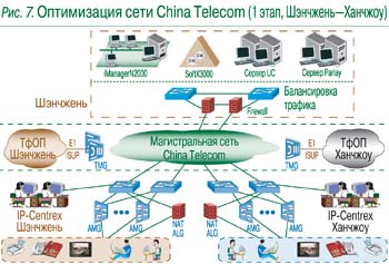 Первый этап реконструкции сети начался в апреле 2004 г. в городе Шэнчжень с уровня транзитных АТС (рис. 7). Одновременно с их заменой проводилась вертикальная оптимизация сети Shenzhen Telecom емкостью 4,3 млн линий, обеспечившая переход от многоуровневой иерархии коммутационной сети к «плоской» структуре IP-сети. Помимо этого план реконструкции включал в себя внедрение общей с мобильной сетью биллинговой платформы (SHLR) и построение междугородной сети VoIP. В результате реконструкции портфель услуг Shenzhen Telecom пополнился такими сервисами, как IP-TV, VoD, видеоконференцсвязь; ориентированными на корпоративных пользователей услугами Wide Area IP-Centrex, а также интеграцией узко- и широкополосных услуг, что в немалой степени способствовало повышению конкурентоспособности компании. Абонентам стали доступны также универсальный персональный номер (UPT), персонализированная посылка вызова (CRBT) с роумингом по всей сети, унифицированная связь (UC), бесплатный вызов по ссылке на web-странице (Web800) (см. таблицу).