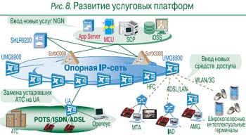 Важную роль в реконструкции уровня доступа играет концепция мультисервисного узла доступа MSAN (Multiservice Access Node). Одноименное устройство поддерживает разнообразные сетевые интерфейсы (E1, STM, GE, FE, ATM); протоколы управления VoIP от сигнального коммутатора; режимы пассивной оптической сети BPON/EPON/GPON для доведения оптики до абонентов. Кроме того, MSAN способен работать в режиме различных шлюзов: TDM to IP, TDM to ATM, TDM/ATM to IP. На четвертом этапе завершается замена устаревших местных АТС на MSAN (UA5000 и др.) и развертывание услуговых платформ (рис. 8), производится внедрение мультимедийных услуг: IP-TV, VoD, VSC, IP-Centrex для корпоративных абонентов, услуг сторонних поставщиков по интерфейсу Parlay, а также услуг аутсорсинга корпоративной связи UC (Unified Communication) с платформ сетевого оператора. Для успешного внедрения услуг NGN потребуется применение интегрированных устройств доступа IAD и широкополосных интеллектуальных терминалов.