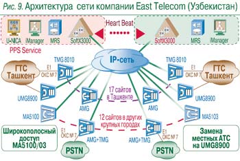 На первом этапе была построена сеть емкостью 11 тыс. линий, охватывающая 17 площадок на ГТС Ташкента. На втором – емкость сети, развернутой в 12 городах Узбекистана, увеличилась до 60 тыс. линий. Третий этап, реализуемый сегодня, предполагает ее расширение еще на 40 тыс. Результатом проекта, в ходе реализации которого была достигнута вертикальная консолидация сети на транспортном и на местном уровнях, стали внедренные на сети оператора современные услуги и функции. В их числе, помимо базовых речевых услуг POTS, – поддержка многозоновых кодов на сигнальном коммутаторе SoftХ3000, IPCentrex, видеотелефония и видеоконференцсвязь, взаимодействие локальных компьютерных сетей по FE, широкополосный ADSLдоступ, аренда выделенной линии E1 G.SHDSL.