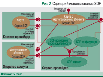Сценарии использования SDF разрабатываются соответствующей рабочей группой TM Forum и служат для отработки требований, предъявляемых к функциональным блокам, которые составляют основу рассматриваемой концепции. Сценарии позволяют наглядно продемонстрировать, о чем идет речь при обсуждении того или иного функционала. Также они полезны при проектировании и реализации пилотных проектов, базирующихся на данной концепции.На рис. 2 приведен сценарий использования функционала SDF для сборки новых продуктов на базе существующих сервисов в случае, когда бизнес-модель опирается на несколько участников – оператора доступа, контент-провайдера и сервис-провайдера.