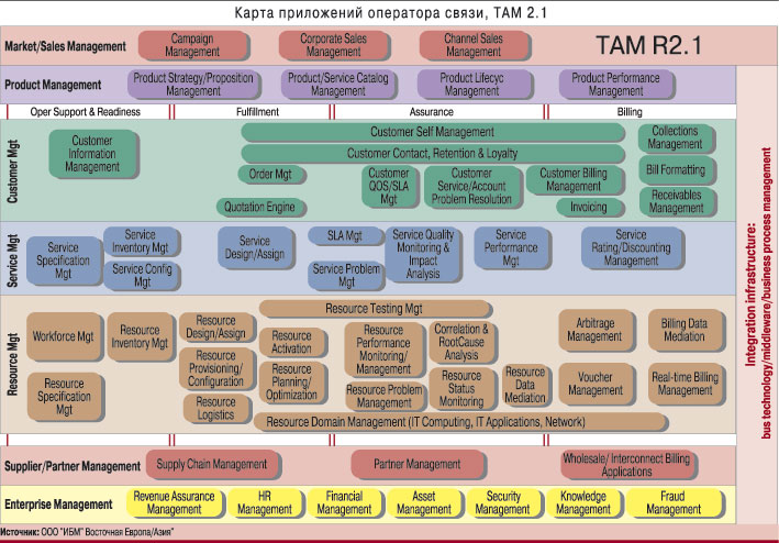 Третья тенденция – стандартизация биллинга. Современные биллинговые системы поставляются в виде набора отдельных модулей (тарификатор, продуктовый каталог, модуль обслуживания абонентов и т.д.) и более открыты для интеграции. Стандартизация биллинга осуществляется на основе единого телекоммуникационного стандарта, разработанного TMForum, – Telecommunication Application Map, ТАМ (см. рисунок).